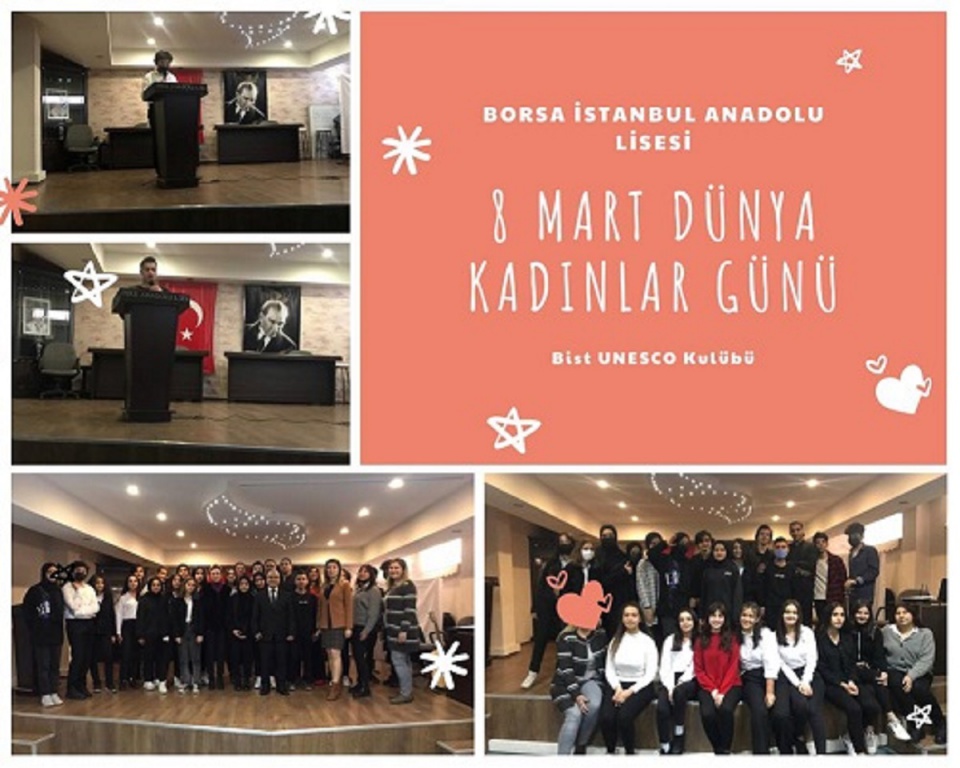 Okulumuz Unesco kulübü öğrencileri 8 Mart Dünya Emekçi Kadınlar Günü'nü kutlamak için bir tören düzenledi. Törende kadınlar günü kutlandı ve Unesco kulubünün proje konusu olan "şiddet", öğrencilerin "Kadına Şiddete Hayır" teması ile işlenip gösteri okul öğrencilerinin de bulunduğu törende sergilendi ve ilgi gördü.